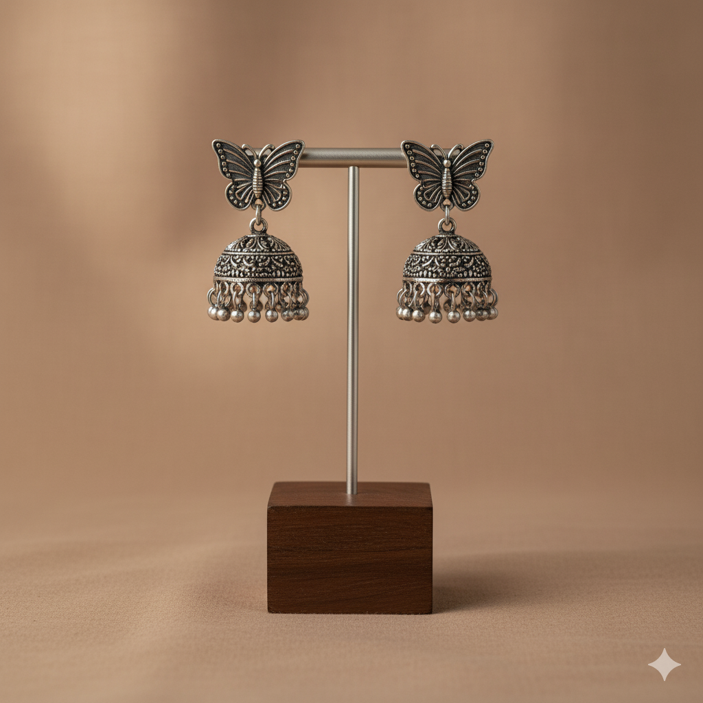 Nature's Grace: These oxidized silver jhumkas feature beautifully crafted butterfly motifs. A unique and enchanting design for those who love intricate details.