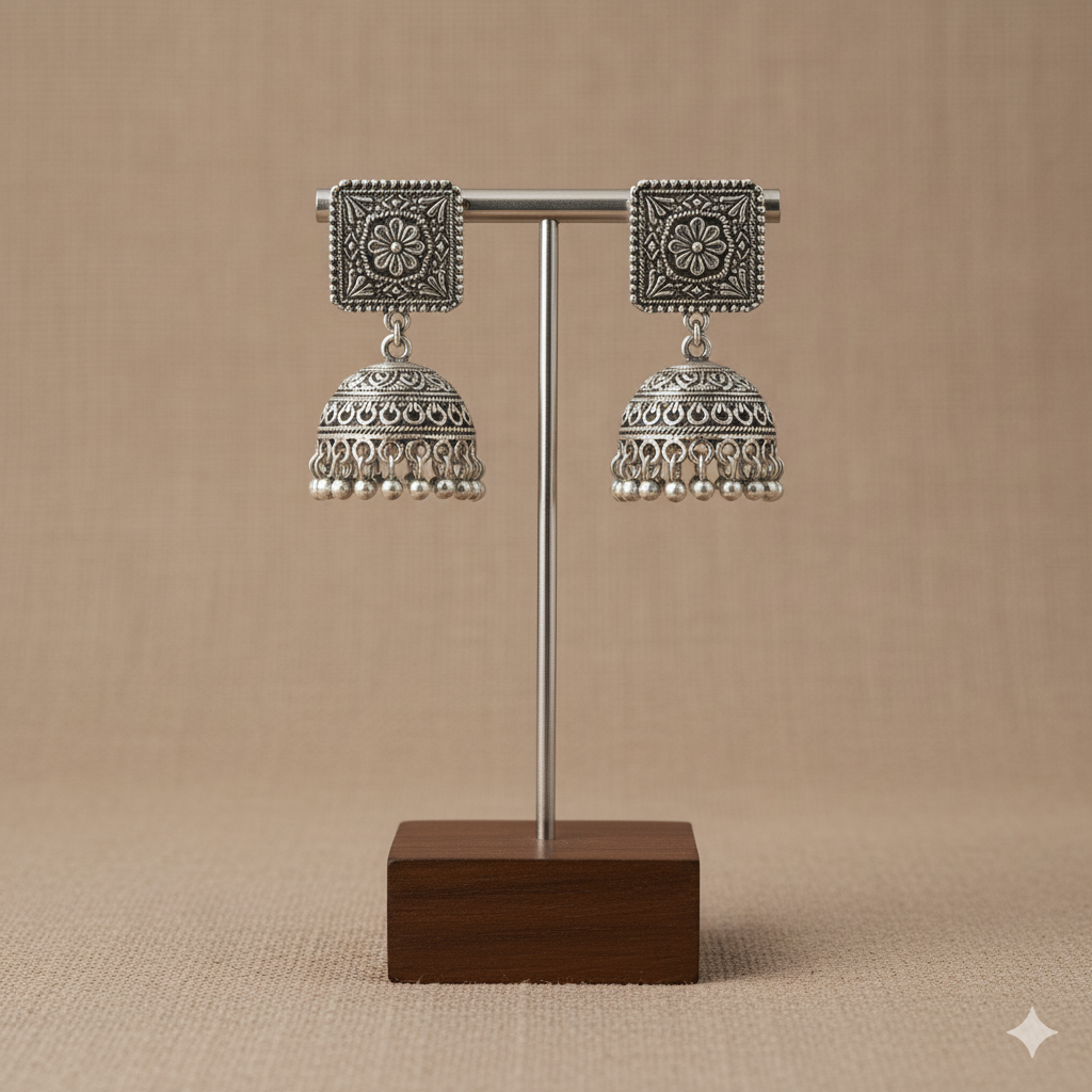 Statement Squares: Stand out with the Motif jhumkas. These oxidized silver earrings combine a bold square design with delicate bell drops for unique elegance.